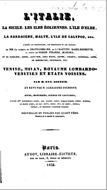 Vol. 3, Venise, Milan, Royaume Lombardo-Venitien et États voisins, par M. Hyp. Hostein.Paris, Audot Libraire-Éditeur, 1836 |