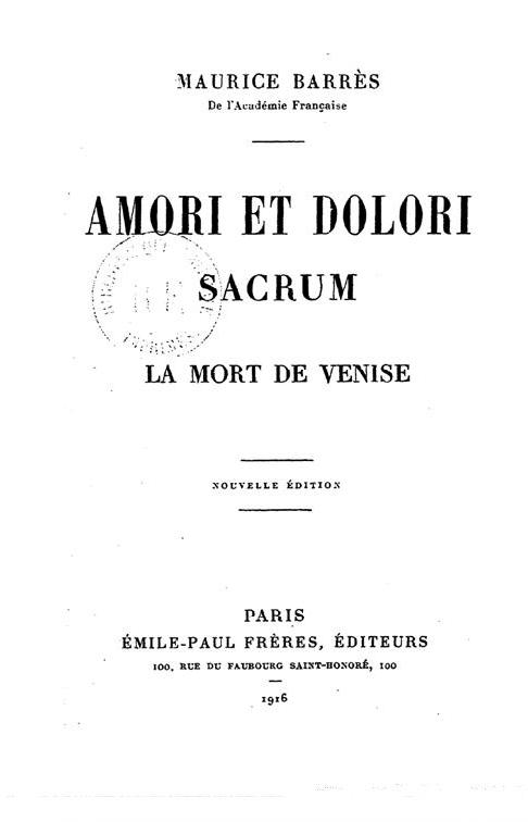 | 1903 | Amori et Dolori sacrum. La mort de Venise. Parigi, Félix Juven, Éditeur, 1903 |