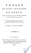 Voyage du jeune Anacharsis en Grèce, dans le milieu du quatrième siècle avant l'ère vulgaire. Troisième édition.A Paris, Chez De Bure l'aîné, Libraire de Monsieur Frère du Roi, de la Bibliothèque du Roi, et de l'Académie royale des Inscriptions; hôtel Ferrand, rue Serpente, n°. 6, 1790 |