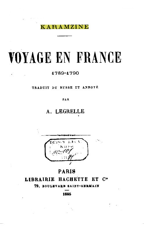 Voyage en France, 1789-1790. Traduit de russe et annoté par A. Legrelle.Paris, Librairie Hachette et Cie, 79, Boulevard Saint-Germain, 1885