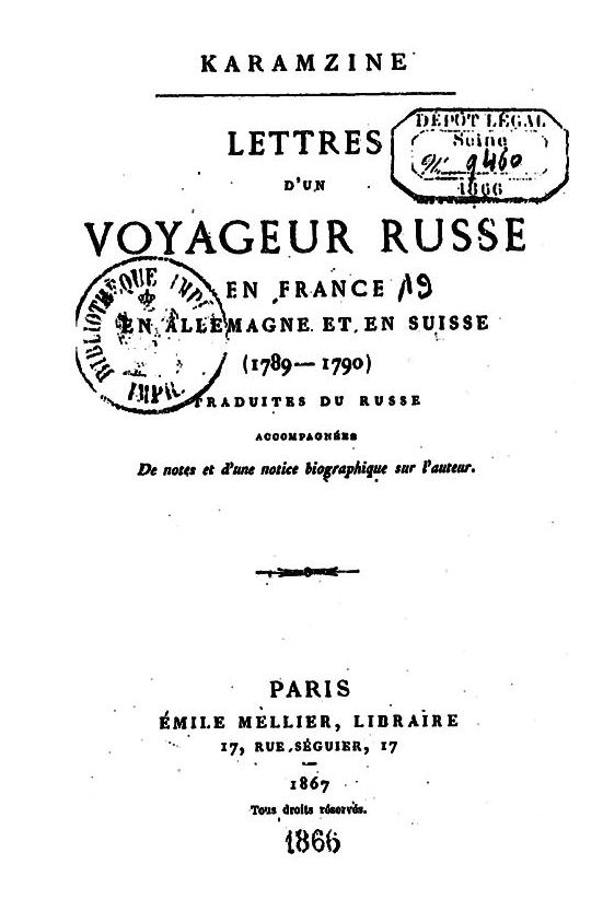 Lettres d'un voyageur russe en France, en Allemagne et en Suisse (1789-1790). Traduites du russe accompagnées de notes et d'une notice biographique sur l'auteur.Paris, Émile Mellier, Libraire - 17, Rue Séguier, 1867 |